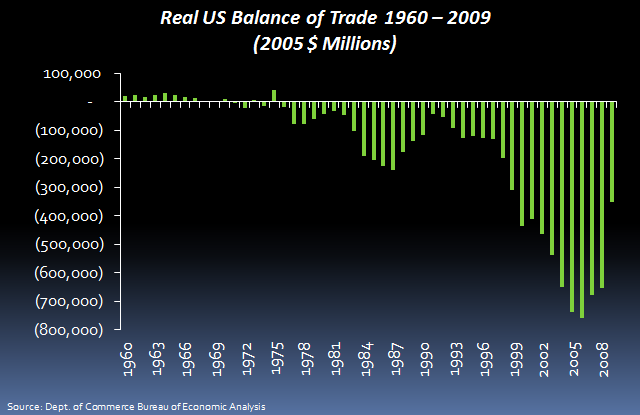 This following graph is from a presentation I gave in 2010 called “Economic Realities of the New Normal.”  It shows the history of the US balance of trade over the past 50 years.