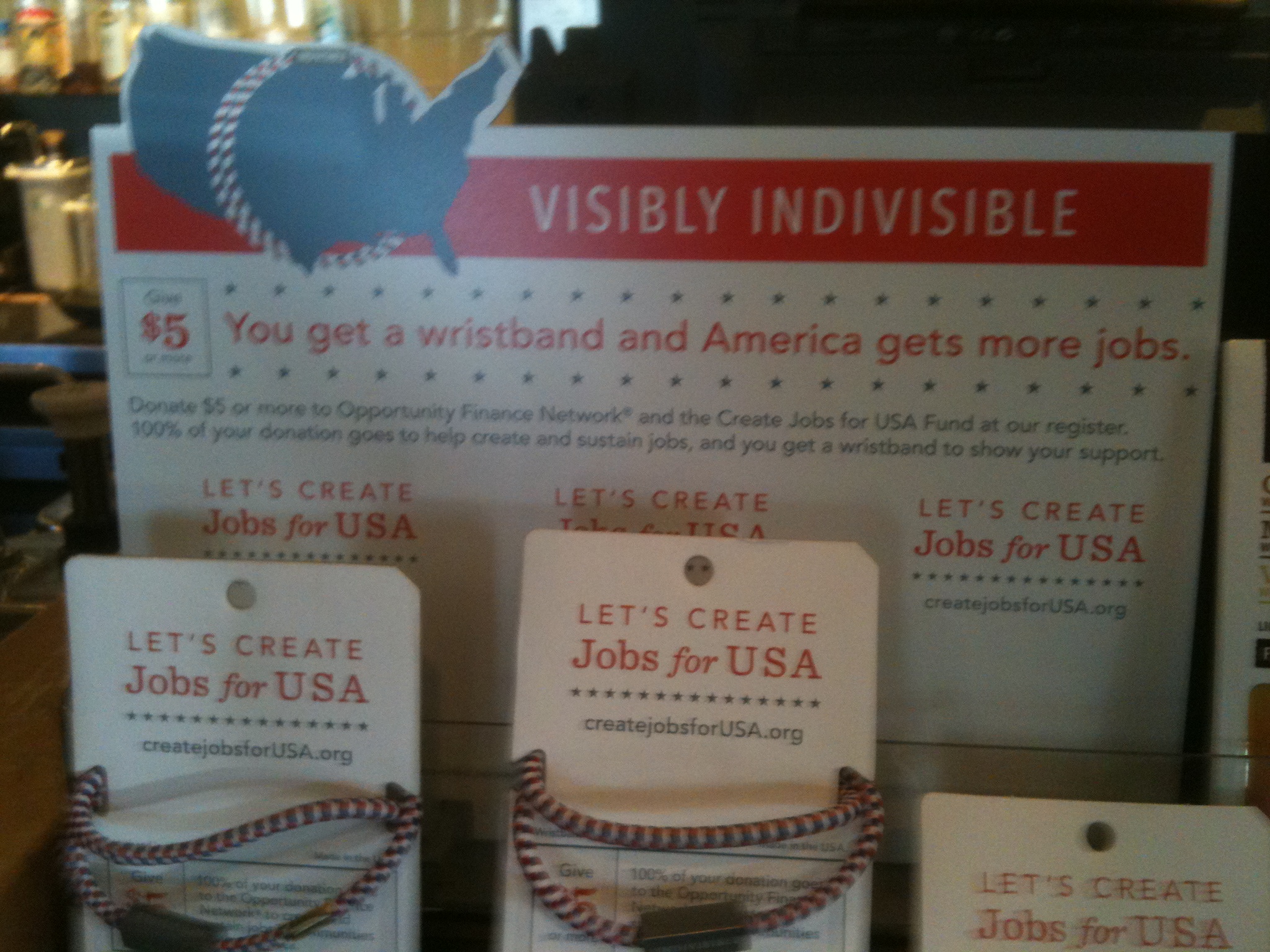 This is not a game.  We have serious issues to address.  I took the picture below at a Starbucks.  As best I can tell, proceeds from the sale of these bracelets go into a fund that makes micro-loans to American manufacturers.