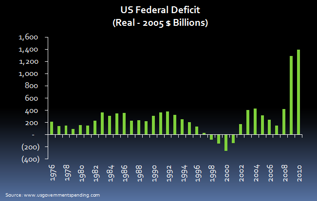 When I was living in Washington, DC, I heard George Will give a talk.  One thing he said that stuck with me is that our fiscal problem is that “every year the American people want $300 billion of services from their government that they’re not willing to pay for.”  He said that in 1983.  A quick look at the graph above shows that he was right, except that we did better in the late Clinton years, and that today, $300 billion has turned into $1 trillion.  (Before my more conservative friends get exercised over Obama and the twin towers on the right, of which two more have now been added, it is worth remembering that the first of those towers belongs to George W. Bush.)