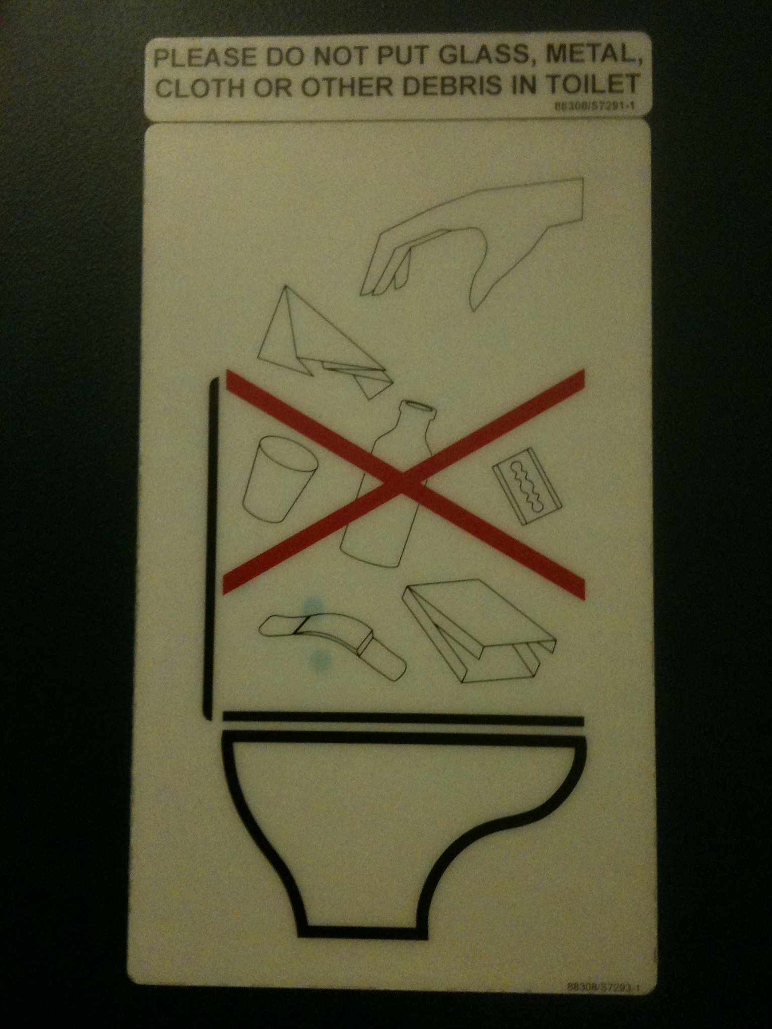 And this one somewhere else, maybe on an airplane. With signs like this, I always wonder what set of events made someone decide it was necessary. In this case, I think it was the milk bottle that caught my eye.