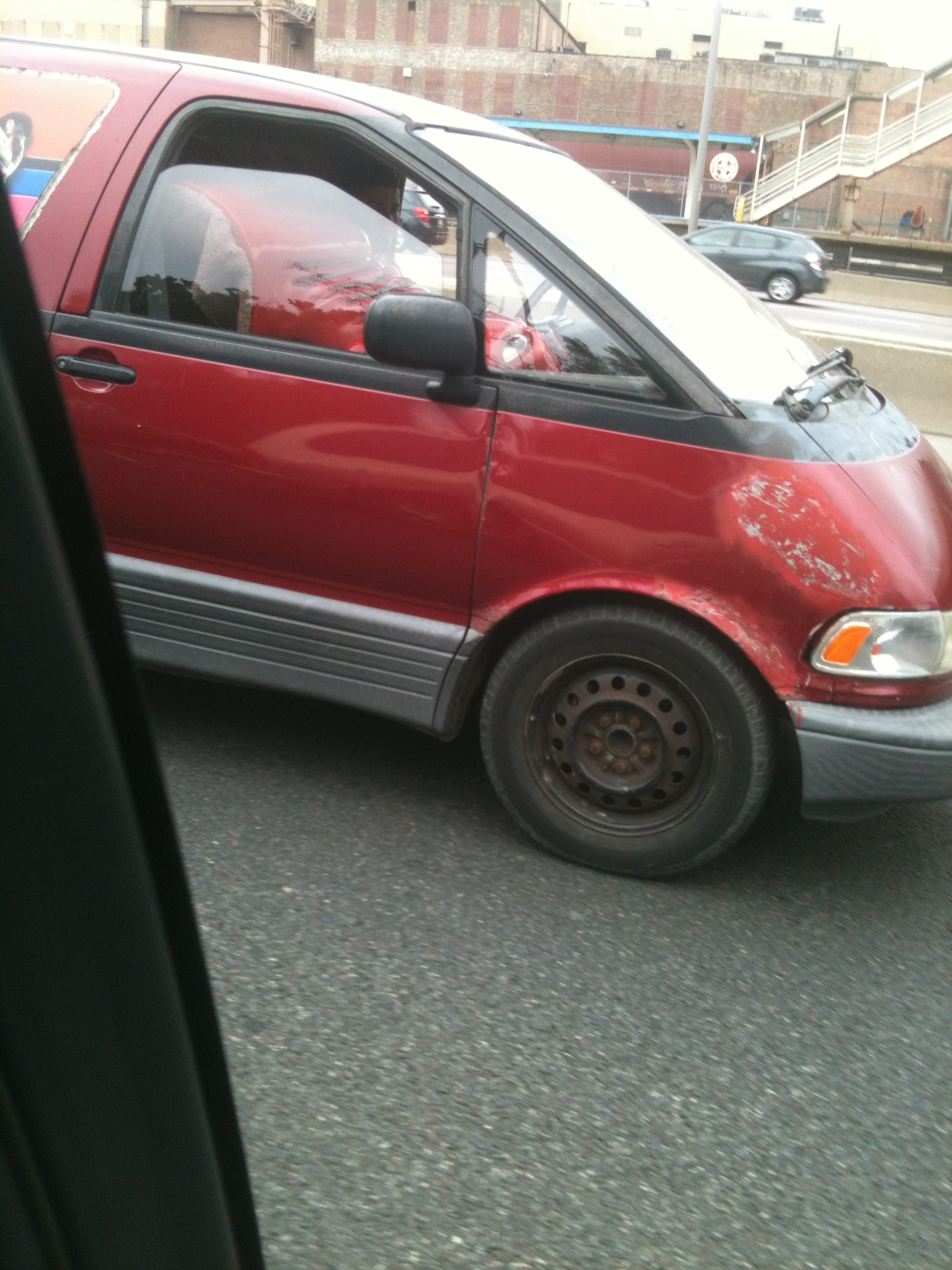It’s a little hard to see, but that thing in the right front seat is a giant, orange plastic cockroach. There has to be a story behind this. I mean, I don’t know about you, but I’ve never been in a situation where the right thing for me to do was put a giant plastic cockroach in any part of my car, let alone in the passenger’s seat. Worse yet, the cockroach was sitting feet up, head down, and the driver was smiling. You want to fill in the blanks? I don’t.