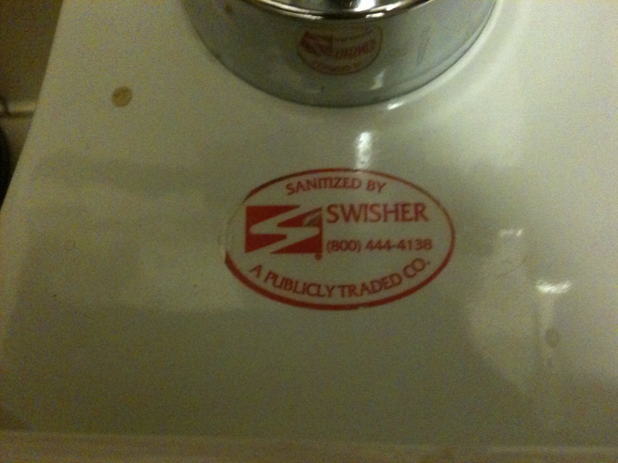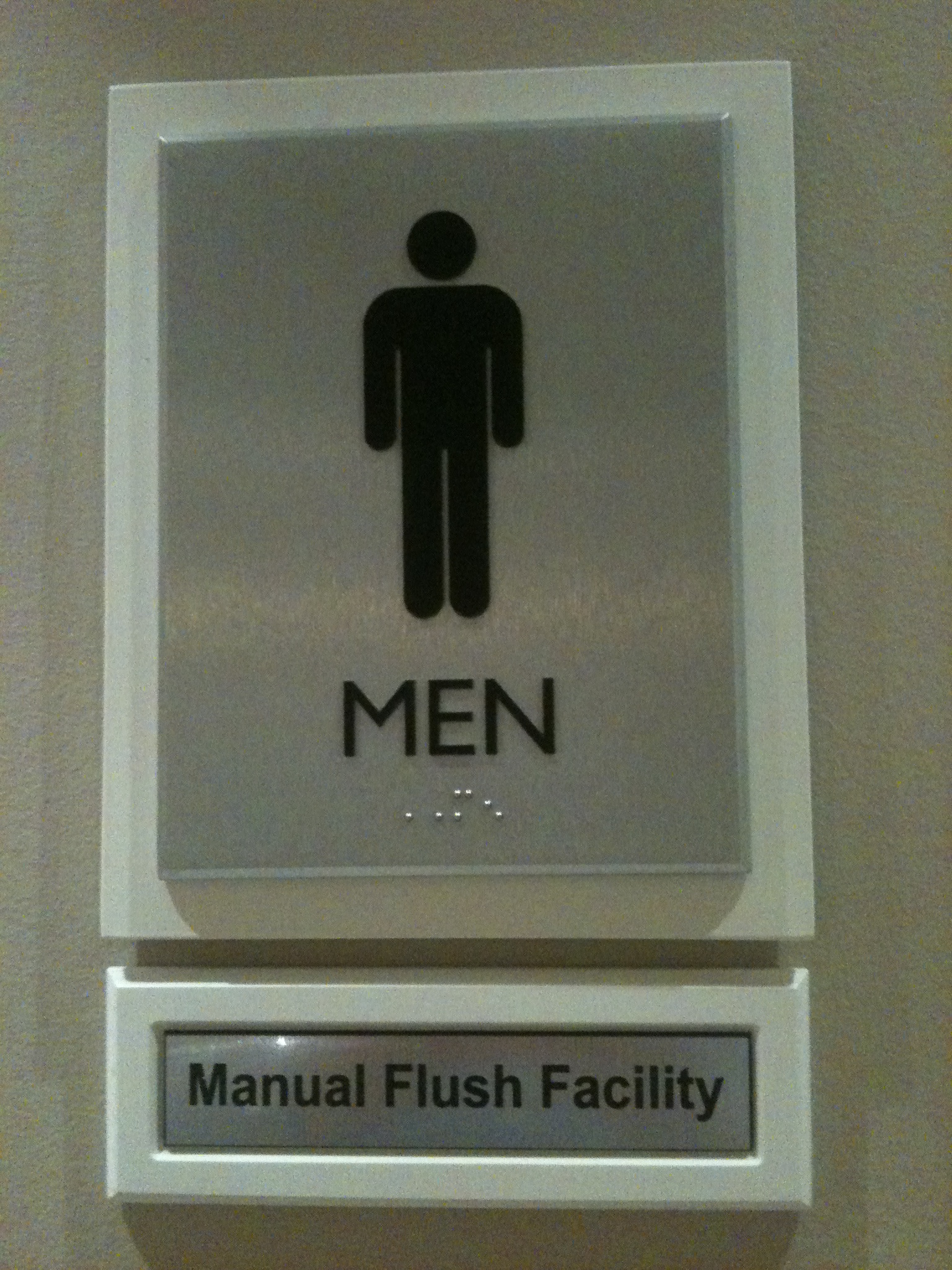 Speaking of wondering what made someone decide it was necessary, I saw this at a Doubletree (yes, the cookie people). I’d never really thought about what goes into a decision to enter a public restroom. I guess I’ve always been satisfied simply to know that it was intended for my gender. Apparently, that’s not always enough information. I suspect (for the obvious reasons) that this isn’t a standard sign. Which means somebody thought about this, decided it was important, and had the sign made. Someone else paid that person to do it. Perhaps this is the OCDoubletree.