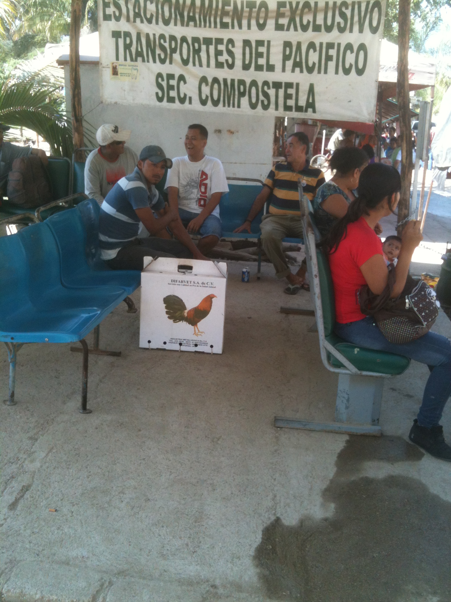 In January, I visited my daughter in Puerto Vallarta, where she was volunteering in an orphanage (yes, she has a very proud dad). We took a bus to a nearby town, where we found these people waiting to take the bus back the other way. I kept hearing a clucking sound, which turned out to be coming from the box in the middle of the picture.