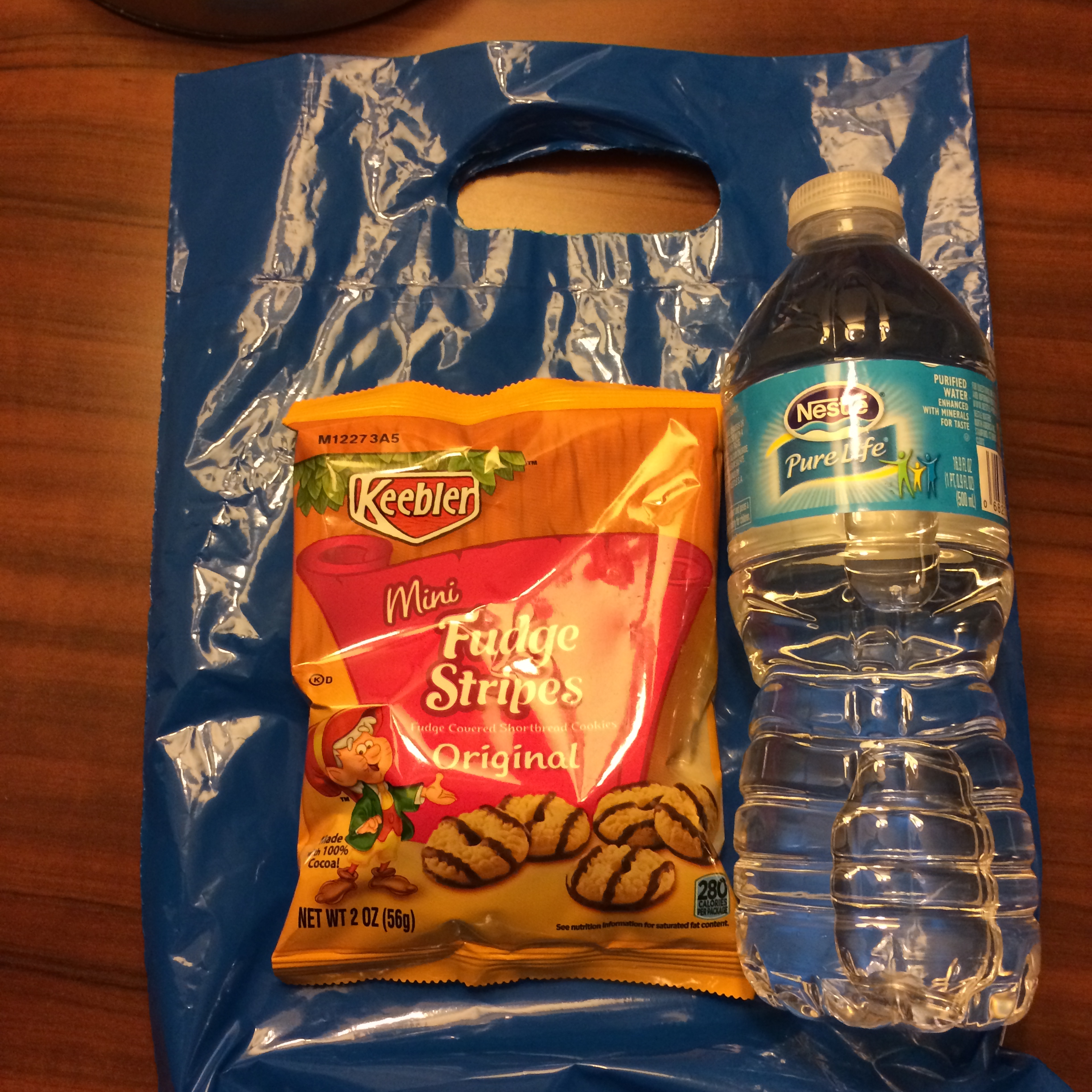 The blue bag looks suspiciously like something you might take with you while walking your dog. On my next visit, the Keebler cookies were gone – replaced by a second bottle of water.