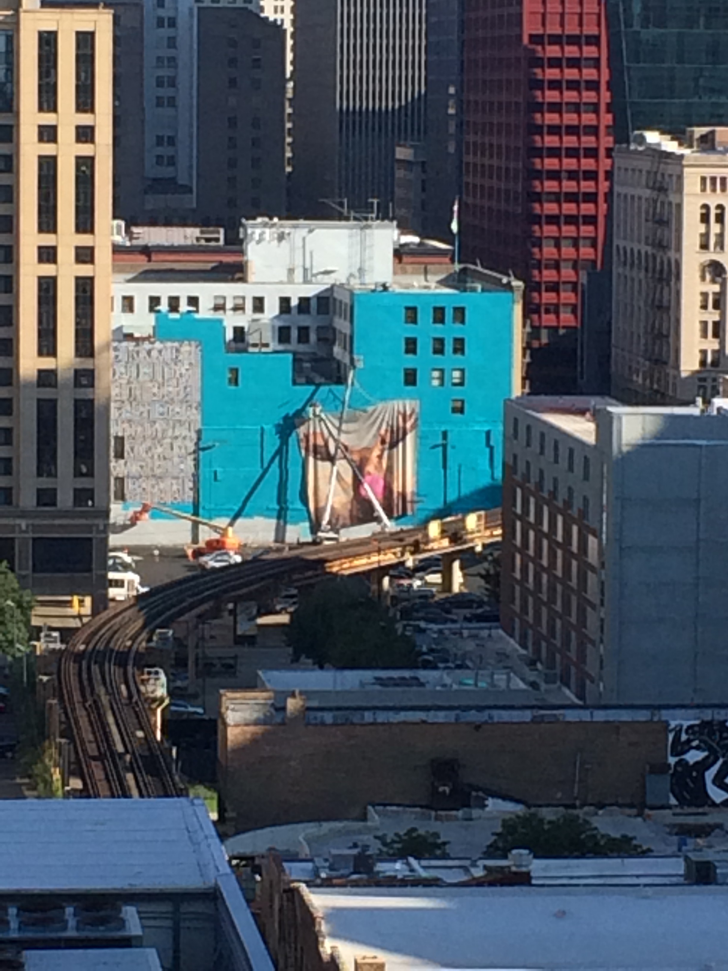 1. Hey! The Wabash Arts Corridor is a committee that is hanging large scale artwork on the buildings on Wabash Street. This one, which is mine, is “Bubblegum Bubble.”