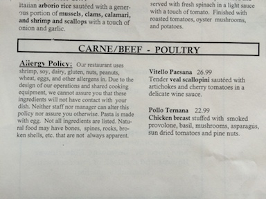 And wrapping up the year, this is the entire beef/poultry section of the menu from a wonderful Italian restaurant. There’s not a lot of beef in the beef/poultry section. For that matter, there’s not a lot of poultry, either.  Lots of lawsuit fear, however.